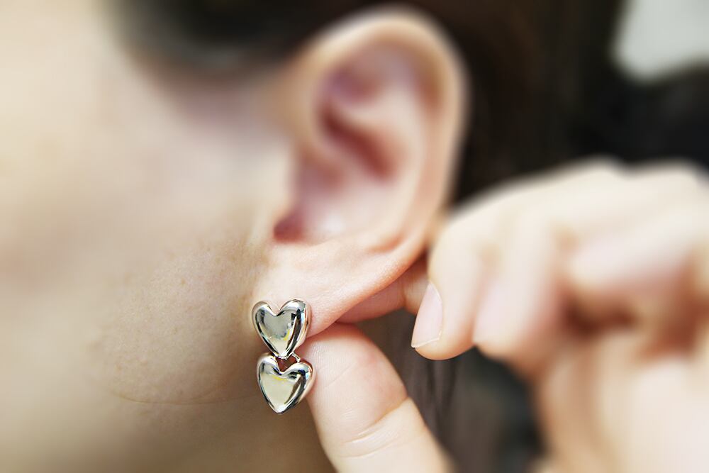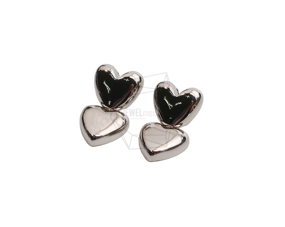 ERG-2501-R/2PCS/Double Heart post earring/12mm x 22mm/Rhodium Plated Over Brass ,Titanium post