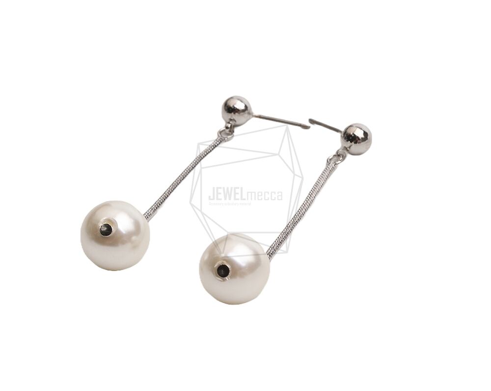 ERG-2556-R/2PCS/Round Chain linked Post Earring/12mm X 58mm/Rhodium Plated Over Brass,Emotion Pearl,Stainless Post