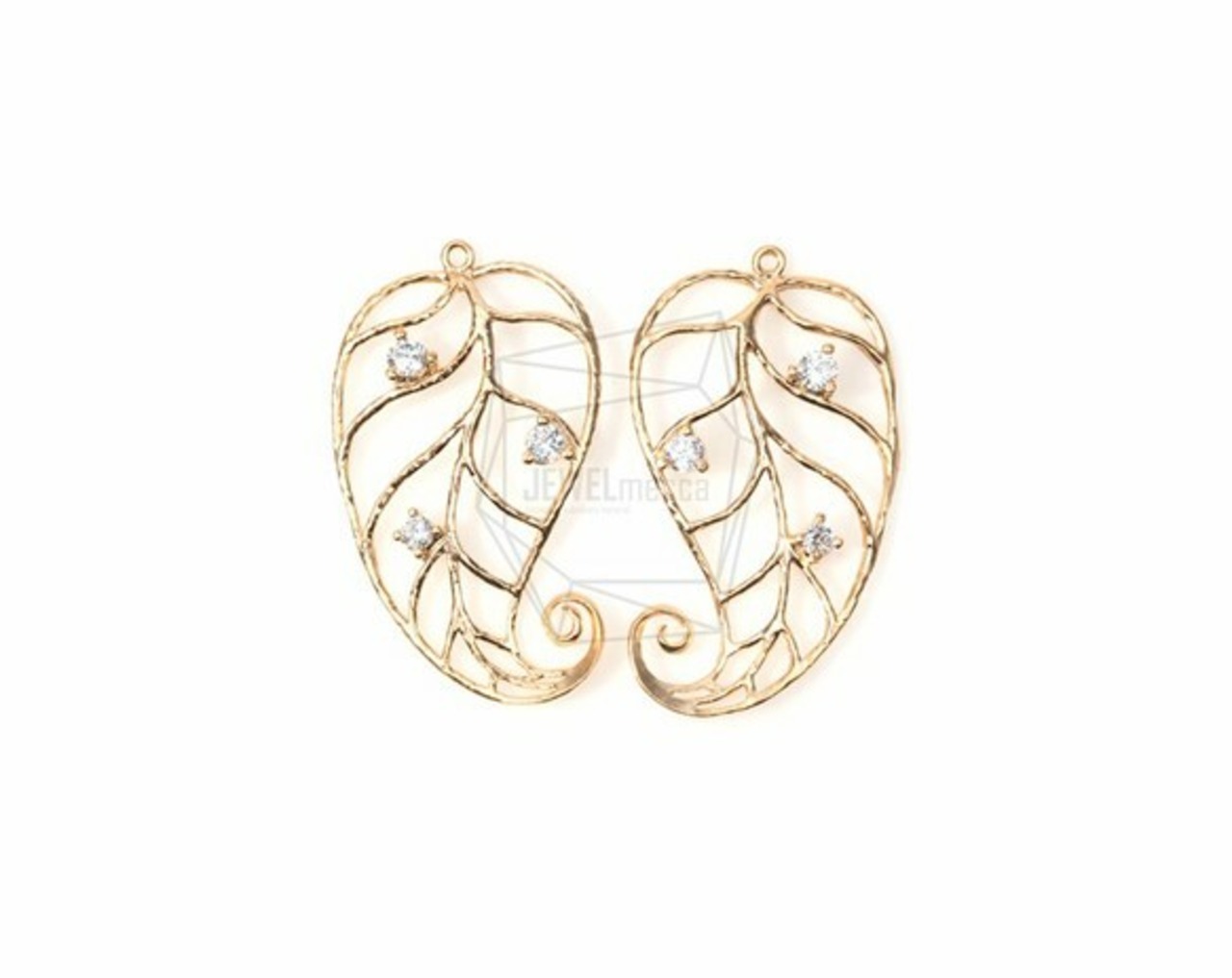 PDT-548-MG/2pcs/19mm x 36mm/Cubic Zirconia Leaf Charm/Curly Leaf Pendant