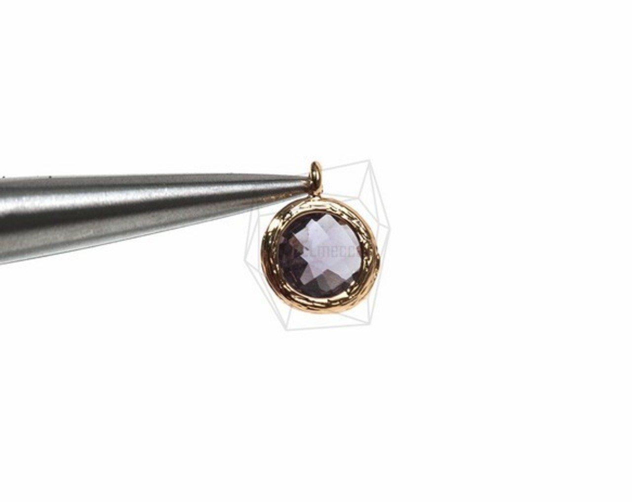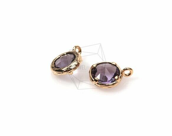 GLA-023-G/2Pcs-Round Framed Stone Charm(Amethyst)/ 8mmx10mm /Gold Plated over Brass