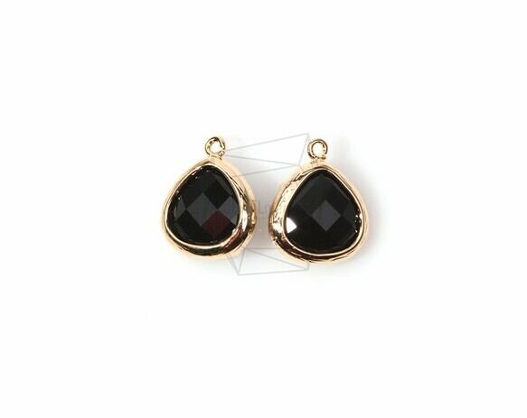 GLA-044-G/2Pcs-Triangle Framed Stone Charm(Black)/11mmx13mm /Gold Plated over Brass