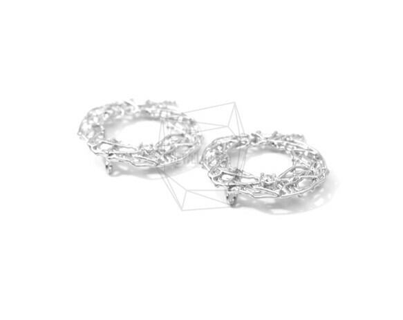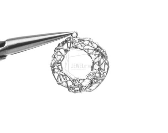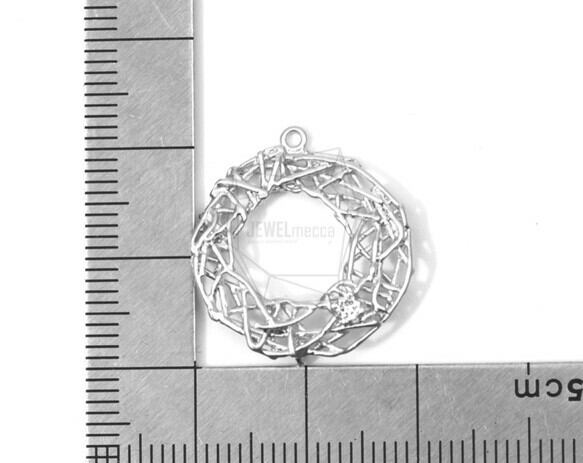 PDT-1294-MR/2PCS/Round Frame Netted Texture With CZ Pendant/20mm X 20mm/Matte Rhodium Plated Over Brass, Cubic Zirconia