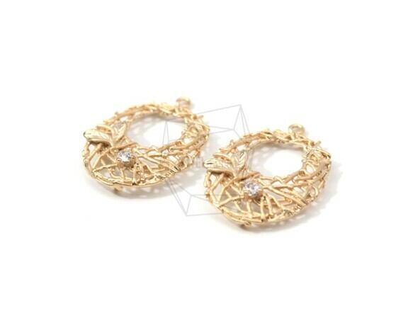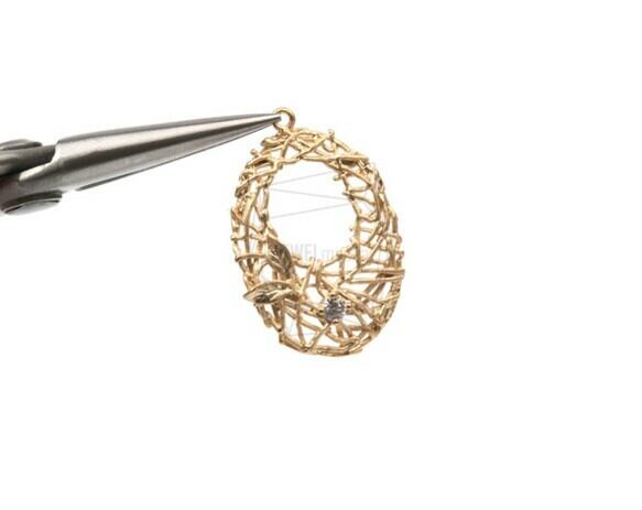 PDT-1295-MG/2PCS/Oval Frame netted Texture with CZ Pendant/15mm X 25mm/Matte Gold Plated Over Brass, Cubic Zirconia