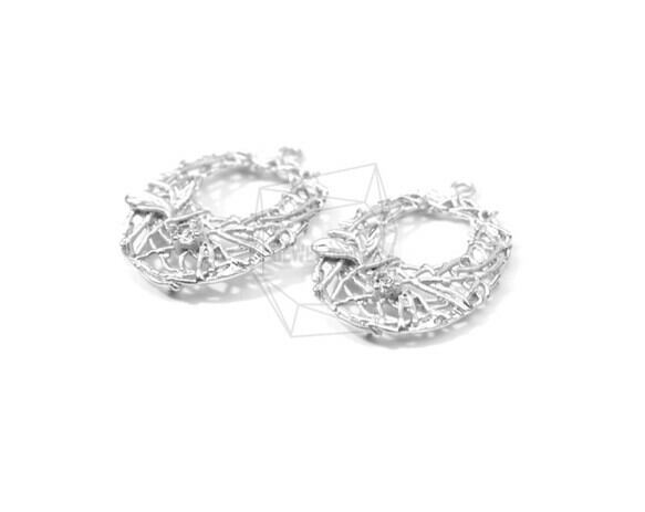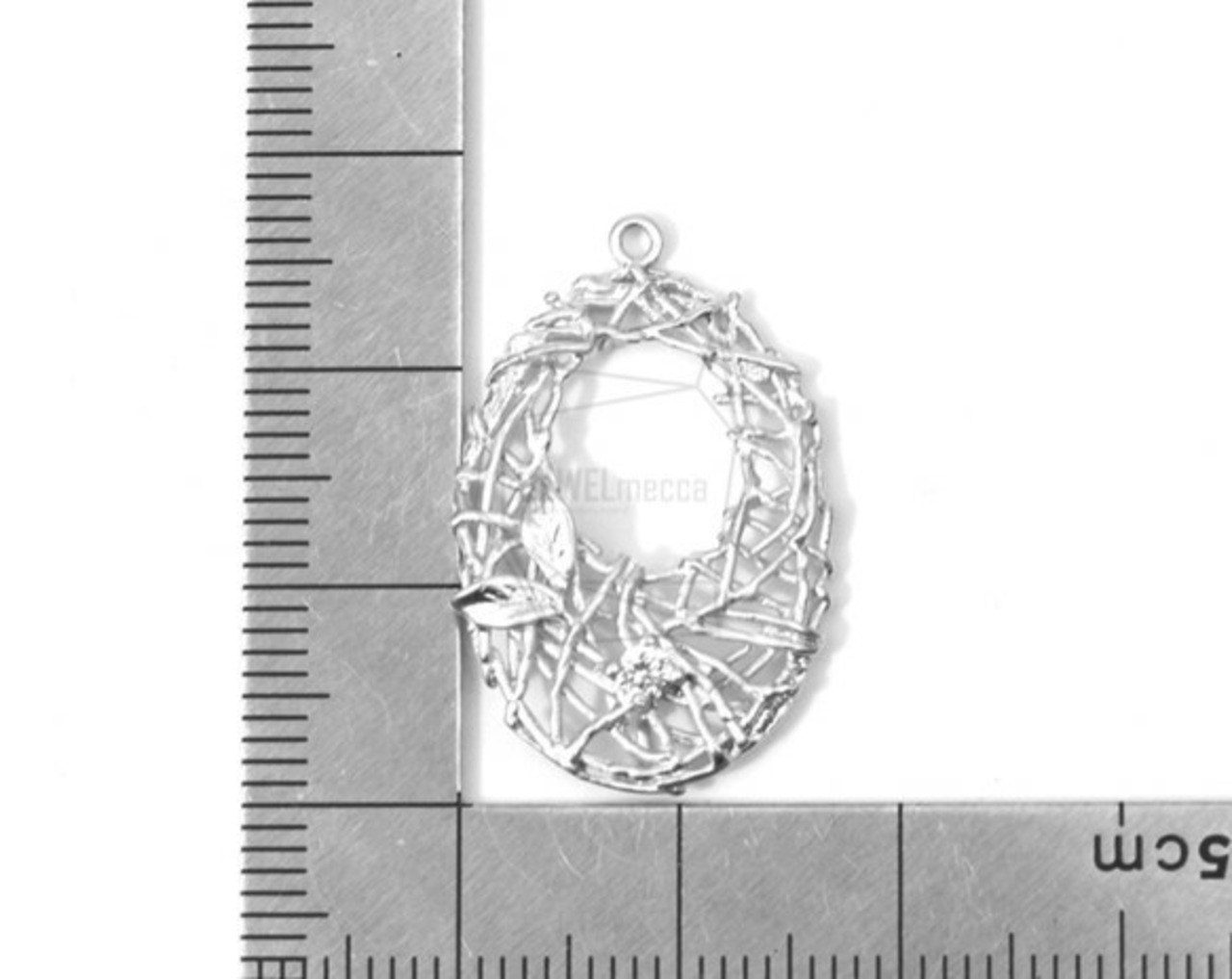 PDT-1295-MR/2PCS/Oval Frame netted Texture with CZ Pendant/15mm X 25mm/Matte Rhodium Plated Over Brass, Cubic Zirconia