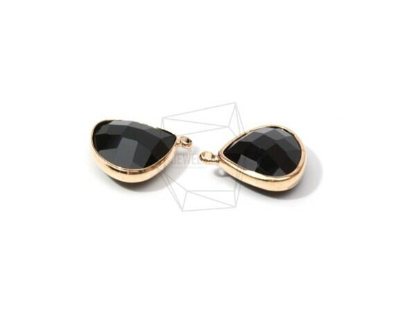 GLA-109-G/2PCS/Triangle Framed Stone Charm(Black)/15mm X 15mm/Gold Plated Over Brass , Glass