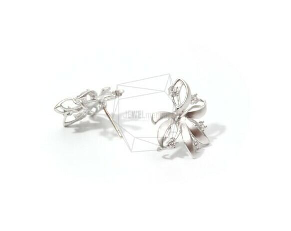 ERG-681-MR/2PCS/Two Layered Petal Post Earring/20mm X 20mm/Matte Rhodium Plated Over Brass, 925 Silver Post, Cubic Zirconia