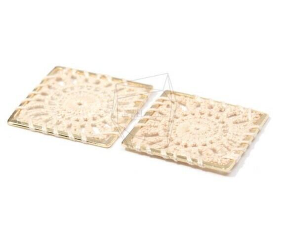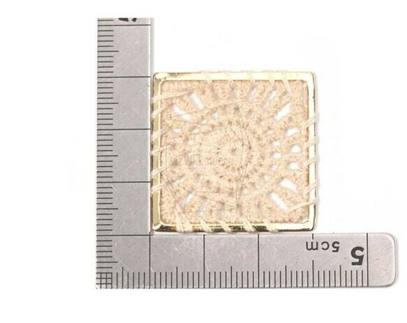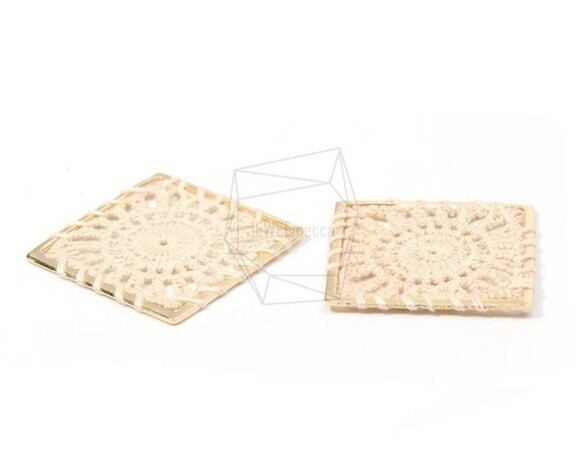 PDT-1478-G/2PCS/Crochet Embroidery Knitting Square Pendant(Light Beige)/30mm X 30mm/Gold Plated Over Brass, Thread