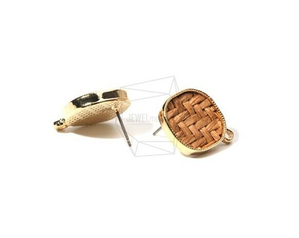 ERG-739-G/2PCS/Round Edge Rhombus Rattan Post Earring(Light Brown)/17mm X 20mm/Gold Plated Over Brass,Titanium Post,rattan