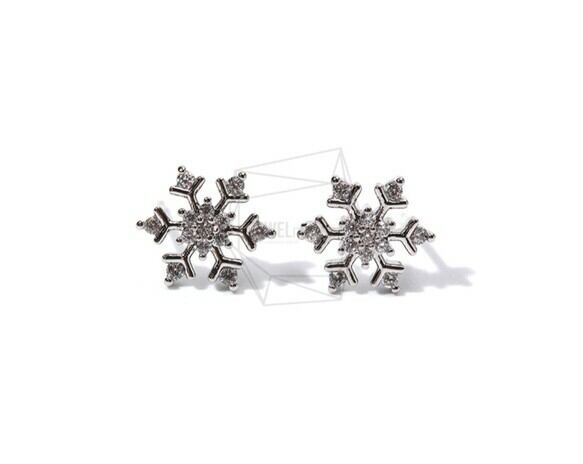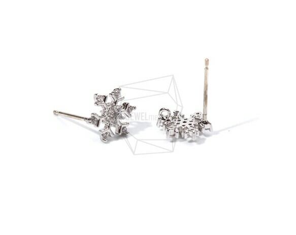 ERG-863-R/2PCS/Snowflake CZ Earring/9mm X 9mm/Rhodium Plated Over Brass,Cubic Zirconia,Silver Post