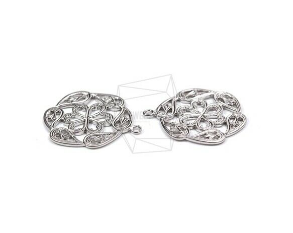 PDT-1785-MR/2PCS/Round Flower Pendant/17mm X 22mm/Rhodium Plated Over Brass