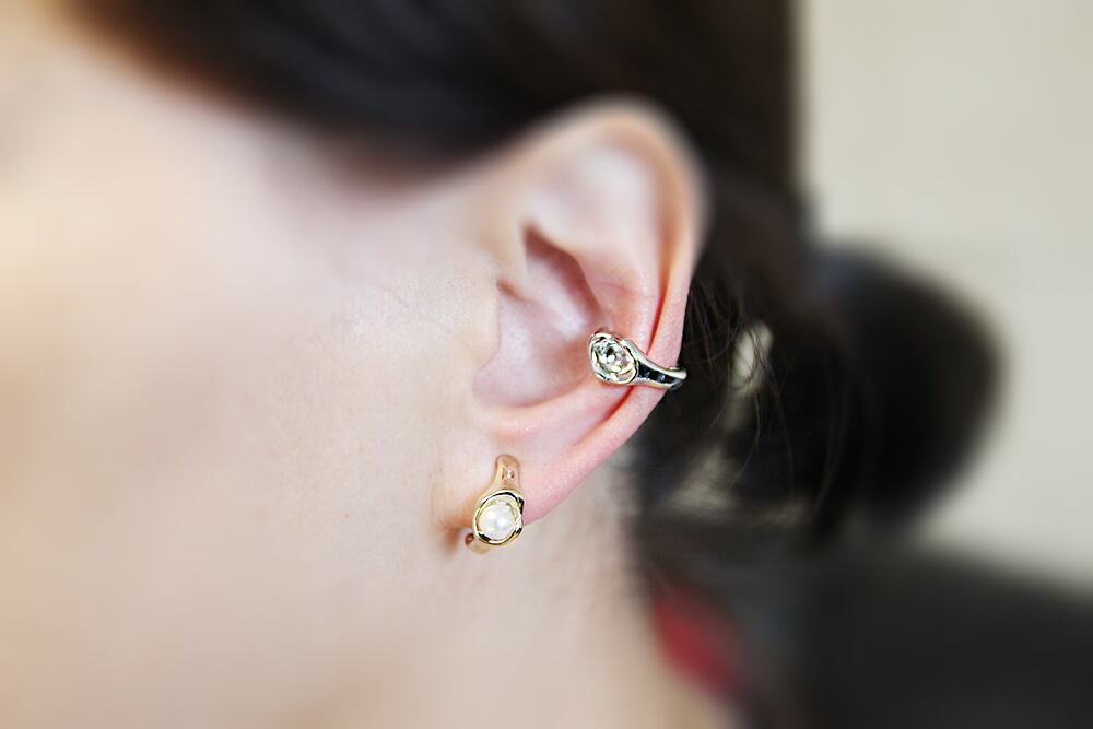こちらの製品は、ワンタッチクリップオン式のためピアス穴がない方でもお使いいただけます。イヤリングまたはイヤーカフとしてもお使いいただけます。お好きな耳の部分に付けてお楽しみください。