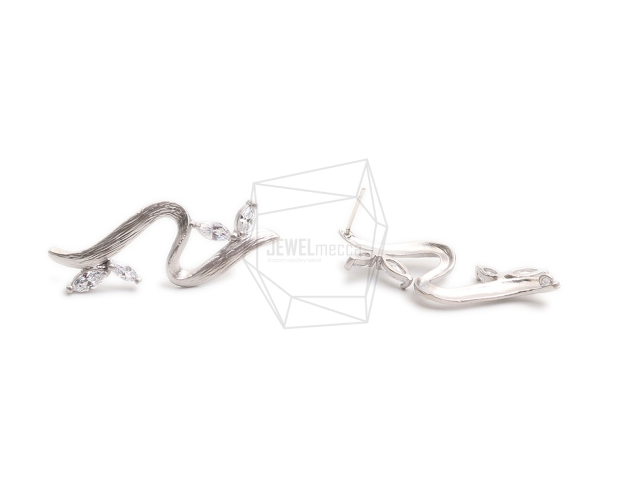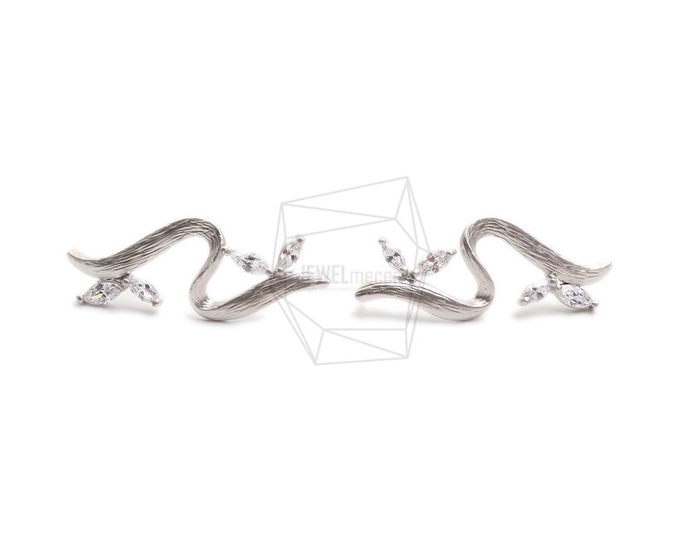 ERG-2302-MR/2PCS/S shape Post Earring /13.8mm X 37.5mm/Matte Rhodium Plated Over Brass,Silver Post.CZ
